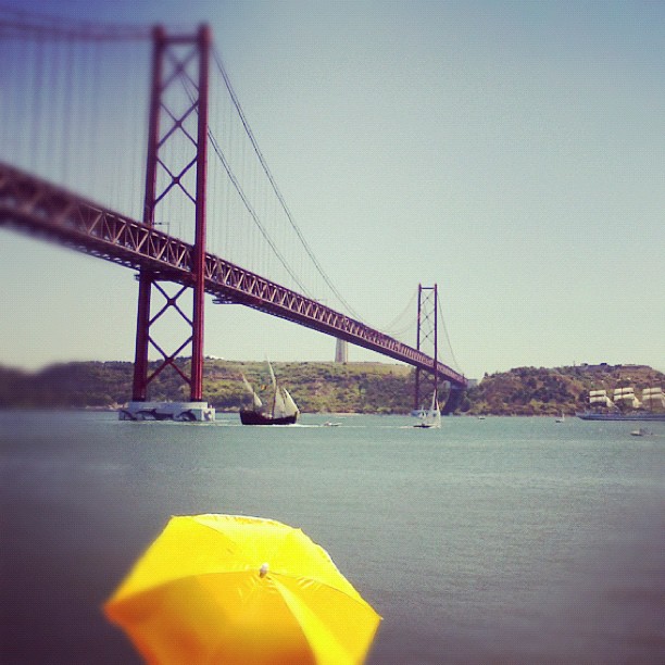 O horizonte do Tejo encheu-se de velas e mastros durante o último fim-de-semana, a propósito da passagem por Lisboa dos mais de 60 veleiros que vão participar na regata "The Tall Ships Races". Tirei a foto acima no momento em que a caravela Vera Cruz passava a ponte 25 de Abril, rumo ao mar. Quem tiver curiosidade, não deixe de espreitar as dezenas de fotografias que foram parar ao flickr, com destaque para as do utilizador JMFAlmeida.
