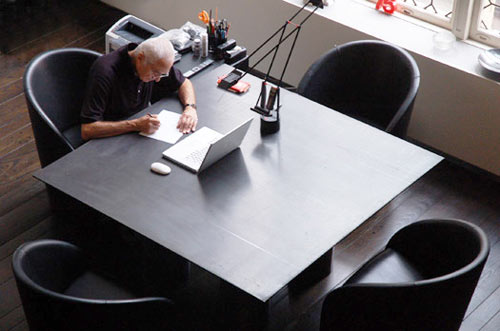 Das secretárias que aparecem no vídeo, a de Massimo Vignelli é a minha preferida. Gosto do minimalismo estratégico (só tem em cima da mesa o estritamente necessário, embora alguns já tenham notado que, em dias normais, deve ser difícil passar por ali um cabo de alimentação para o laptop) e da forma quadrada, a convidar à conversa e discussão em torno da mesa (sem separatórias ou disposições que tornam muito difícil sentar alguém ao nosso lado).