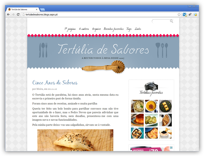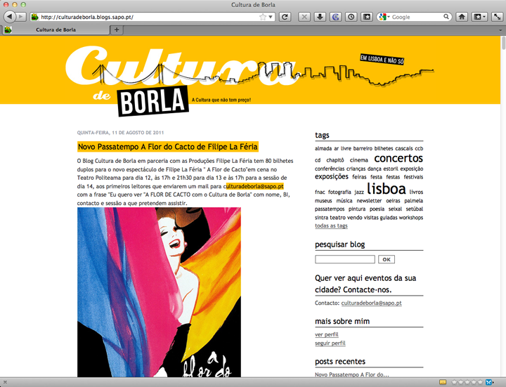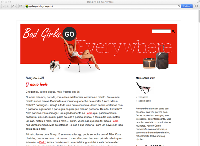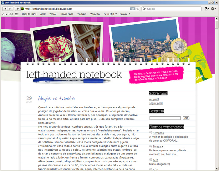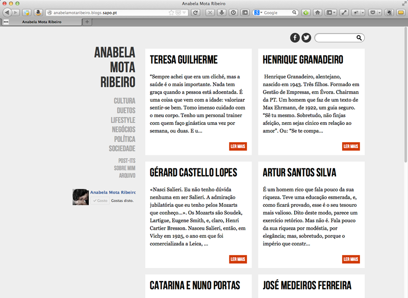 Ajudei a lançar o blog da jornalista Anabela Mota Ribeiro, mas destaco-o aqui sobretudo pelo conteúdo, feito das suas entrevistas a algumas das figuras mais marcantes da atualidade nacional. Joe Berardo, Ricardo Araújo Pereira, Joana Vasconcelos, são algumas das que já li, mas o crescente arquivo do blog está repleto de gente interessante. A de Joe Berardo, em particular, é notável pela opção da Anabela em passar para o registo escrito da entrevista a forma de falar de Berardo, "sem frases arredondadas ou português corrigido". É o tipo de coisa que está ao alcance de poucos entrevistadores fazer e que ao mesmo tempo diz muito sobre o estilo conversacional e descontraído das suas entrevistas. O polémico "palhaço" de Miguel Sousa Tavares surgiu no decorrer da sua entrevista à Anabela e depois de ficar a conhecê-la, durante a construção do blog, consigo entender porquê. Pude ver em primeira mão como a sua descontração (que desarma qualquer um), a par da caneta e caderno, são as suas principais ferramentas de trabalho.